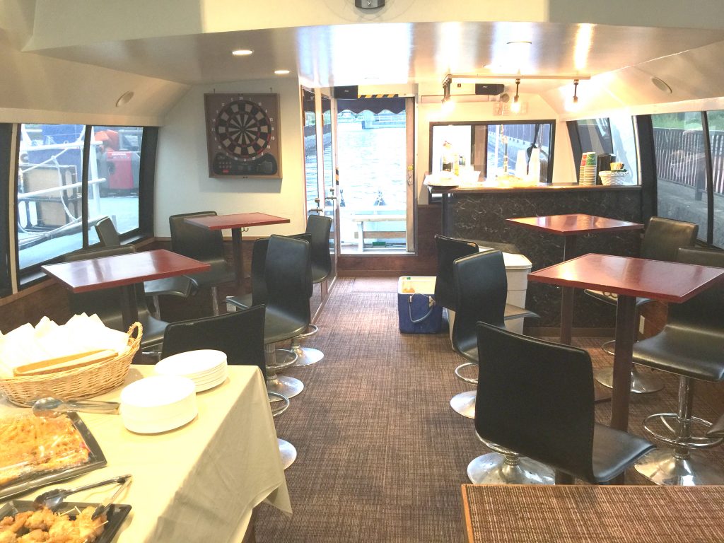 音響映像設備充実の遊び場ラウンジ風の船内は小規模クラブな雰囲気!ソファースペース、バースペースと別れ、立食で交流を楽しみたいパーティーにオススメ!