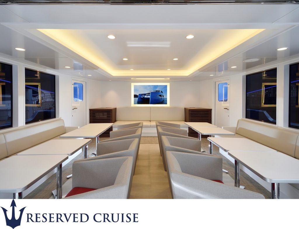 船内は広々としたワンフロアになっており、最大40名様まで着席いただけます。就航したばかりの新艇ですので、内装は非常に奇麗で高級感が有ります。