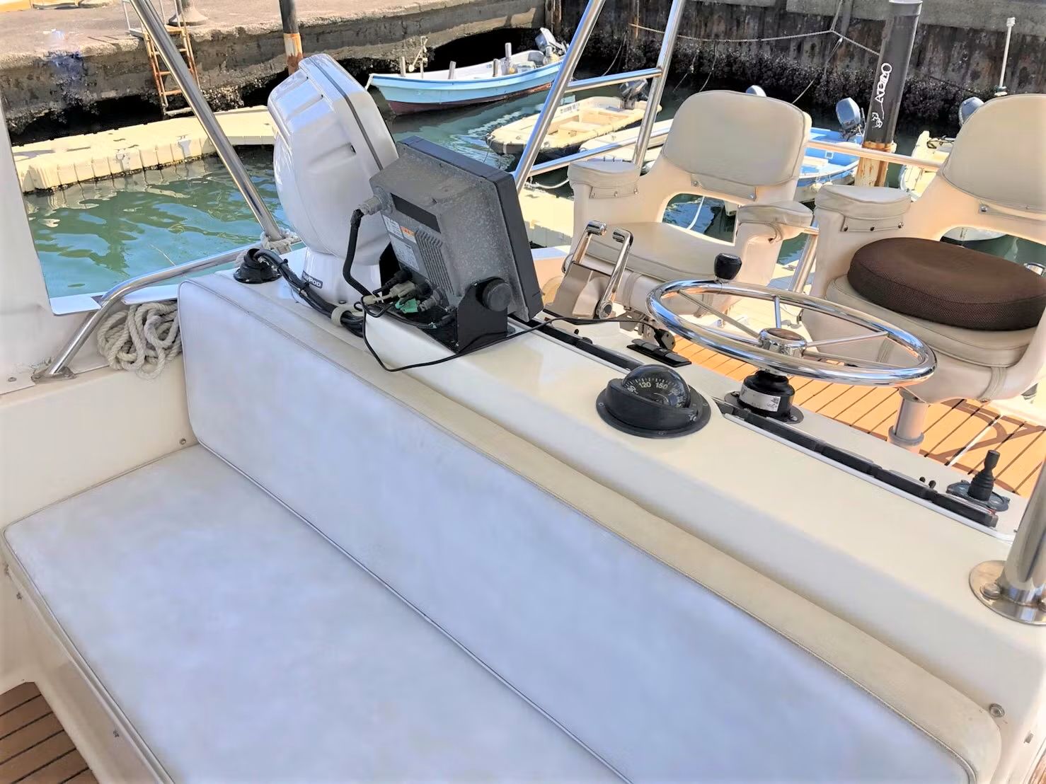 ソファー席を備えた船内と広々とした後方デッキがあり、船上パーティーに最適です。