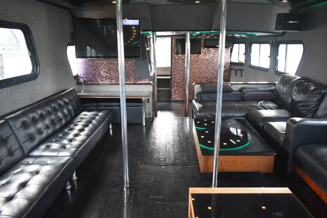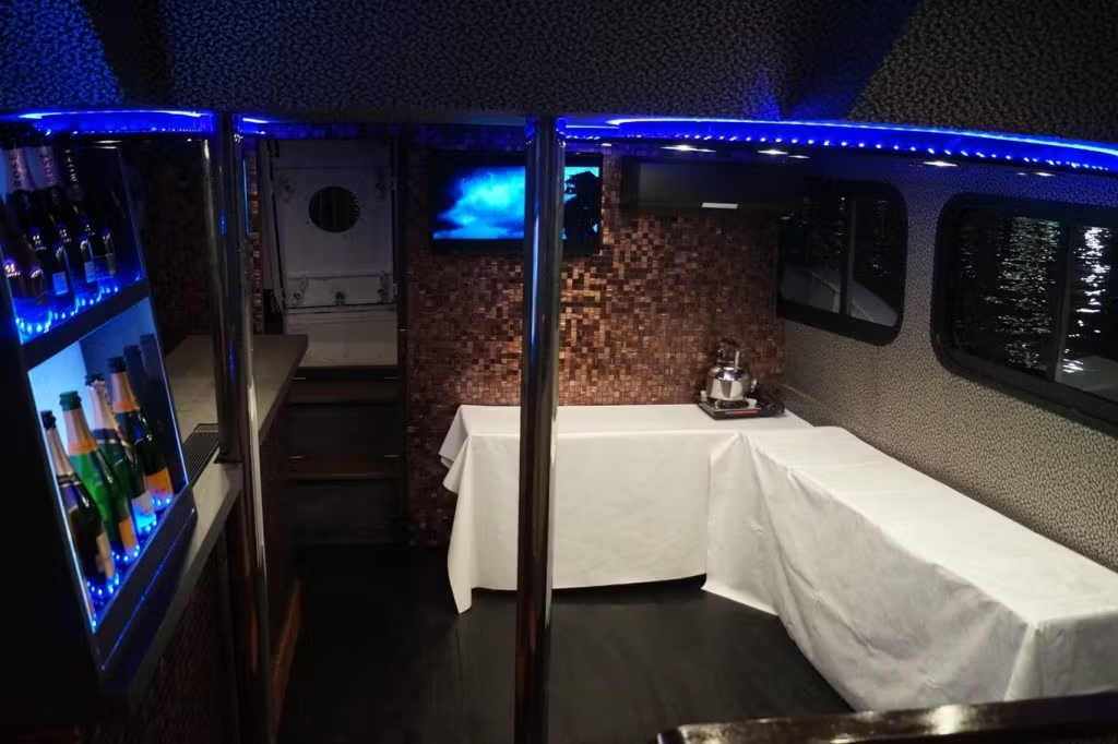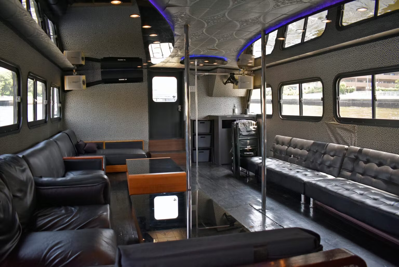 内装はまさに隠れ家ラウンジ風。木製のフロアと色が変化するLEDが参加者の気分を盛り上げてくれます。(船内前方/ドリンクバー側)