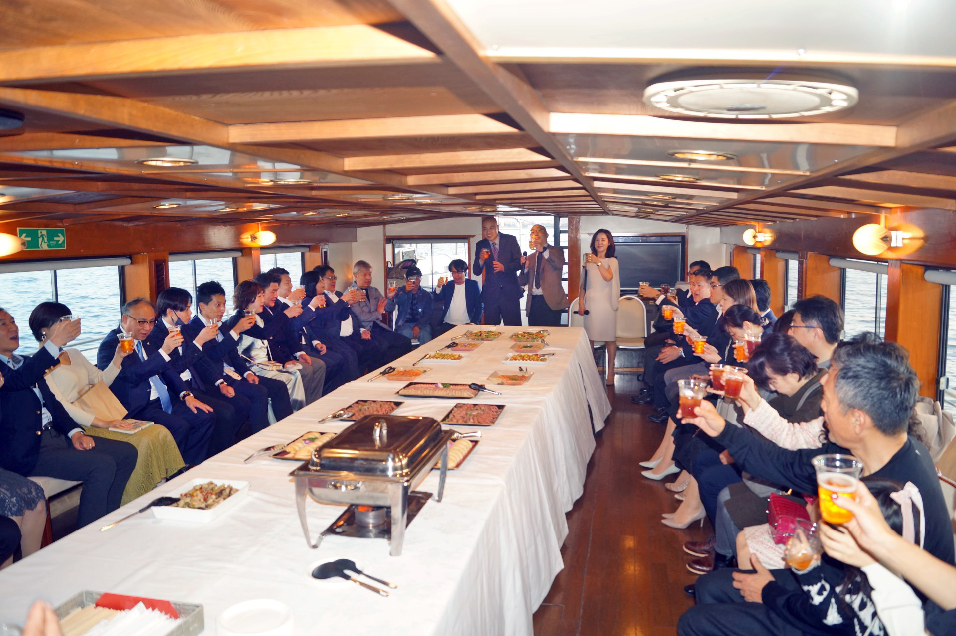 アニバーサリークルーズでは、大小さまざまなクルーザーを70隻以上用意しています。2名~550名と幅広い人数に対応しているので、人数や予算に合わせて船を選ぶことができます。船内がパーティーにぴったりな立食スタイルになっていたり、背の低さを活かして橋梁の下をスイスイ進んだり、船ごとに特徴があり、パーティーの趣旨に合わせて船を選ぶのがおすすめです。クルーザーには冷暖房が完備されているので、寒い冬でも暖かく過ごすことができますよ。もちろん展望デッキがついているので、お台場レインボー花火を特等席から眺めることができます。