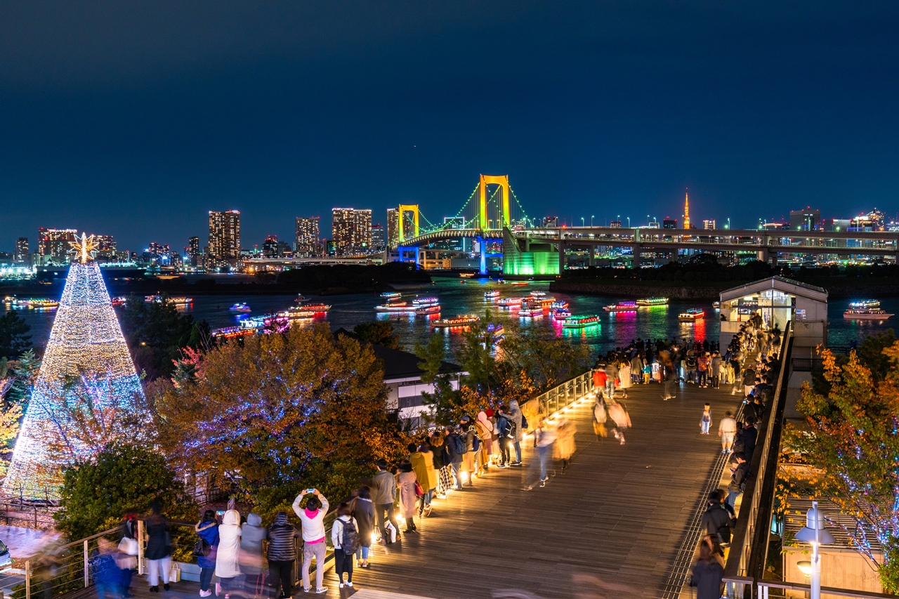 商業施設や観光スポットとしてにぎわうお台場周辺は、クリスマスシーズンになると期間限定のイルミネーションが飾られます。ライトアップされたレインボーブリッジを背景に、光り輝くイルミネーションはデートの定番スポットですよね。そして今年は、1年のなかでも12月だけ開催される「お台場レインボー花火」にも行ってみませんか?