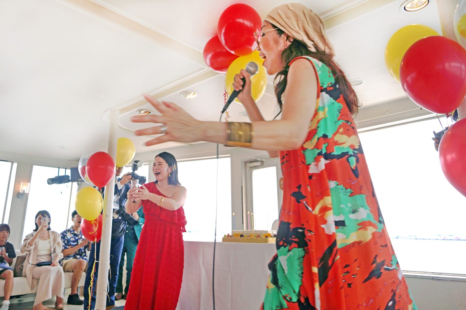 豪華な船内はバルーンで華やかに装飾され、特注ケーキで主役を祝福しました。プロのパフォーマンスやドローン撮影など多彩な演出も用意され、特別なひとときを演出。