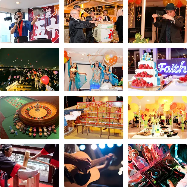 アニバーサリークルーズなら、他のお客様を気にすることなく理想のパーティーが実現できます。ベリーダンサーやマジシャン、マグロの解体ショーを組み込むことも可能です。記載されていないオプションやサプライズでも、可能な限りお手伝いしますので、まずはご相談ください。