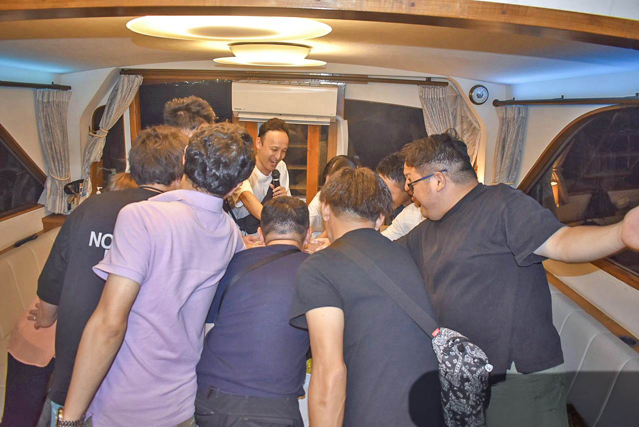 貸切クルーザーに乗り込み、いよいよキックオフ(試合開始)に向けて出航。