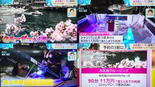 3月26日のTBS系列「THE TIME」「ひるおび」にて「目黒川お花見CHANDONクルーズ」を利用する訪日客がインタビューされました。
