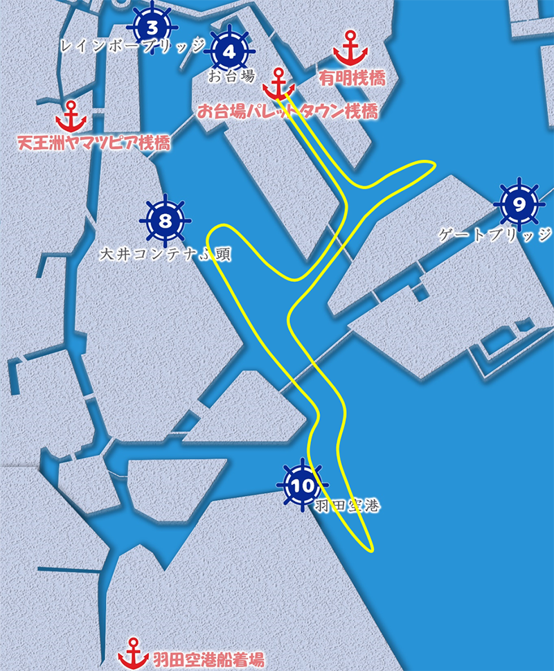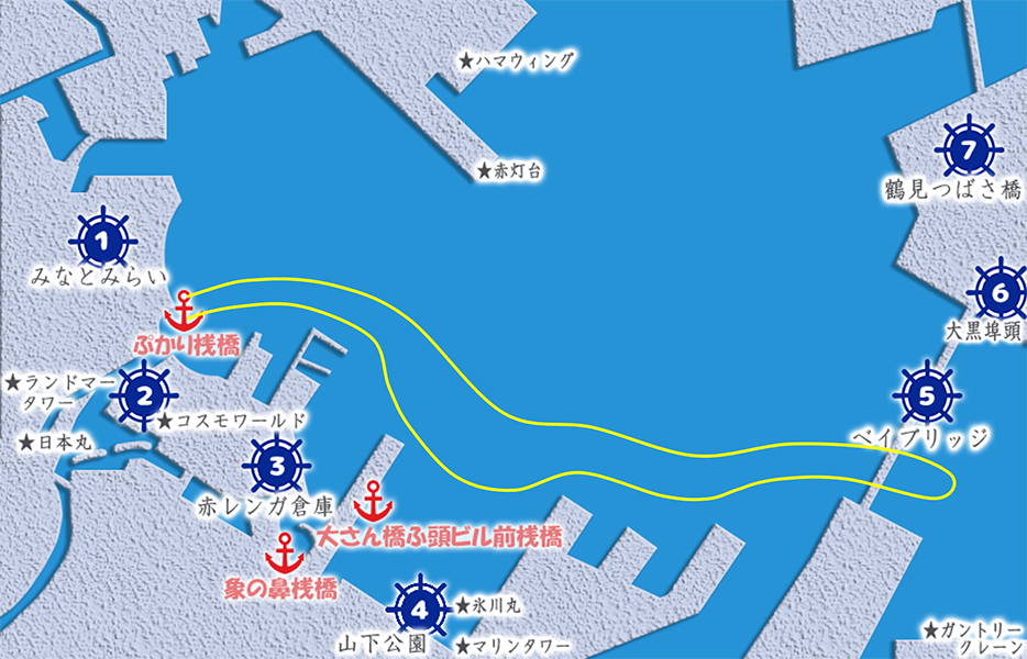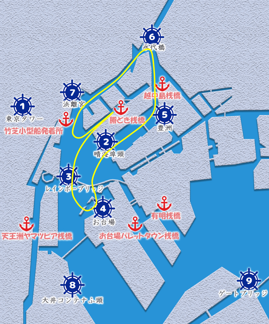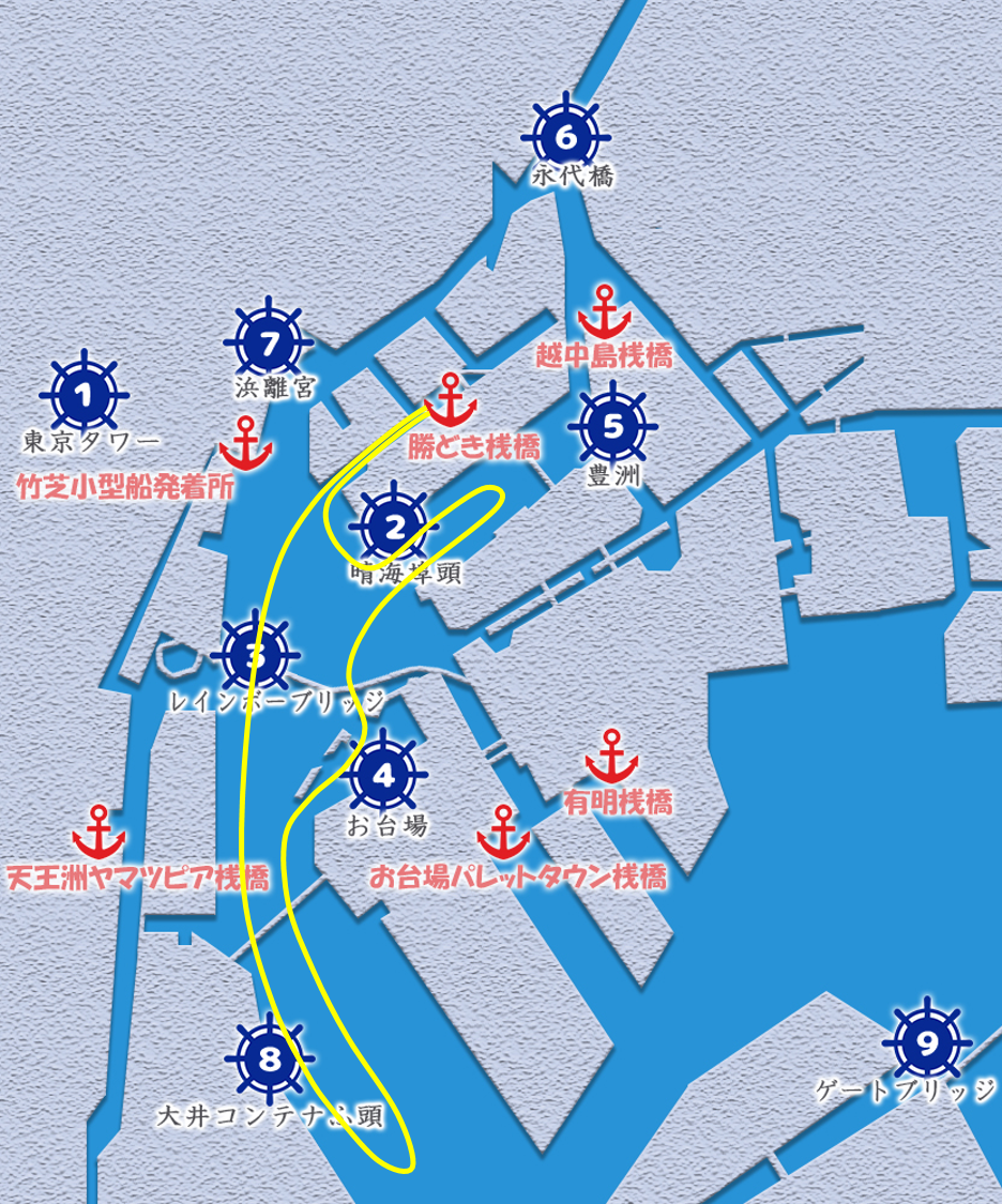 乗下船場所は、東京・横浜の下記の桟橋よりお好きな場所をお選びいただけます。