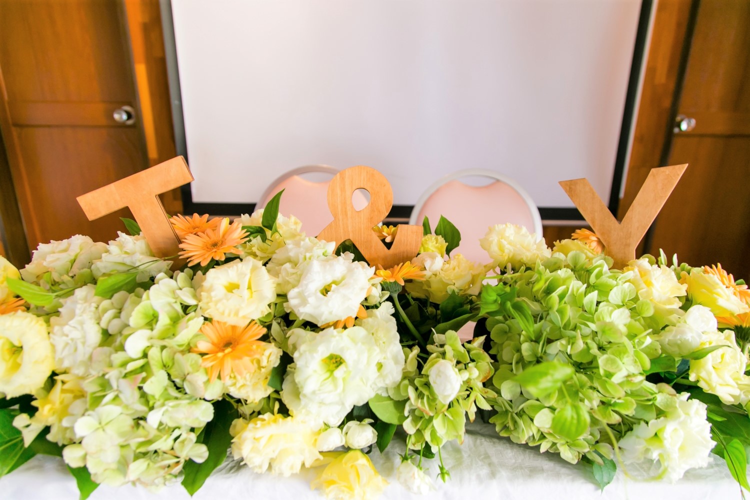 結婚式二次会などのおめでたい席では、主賓の高砂をお花で飾る高砂装花もお勧めです。