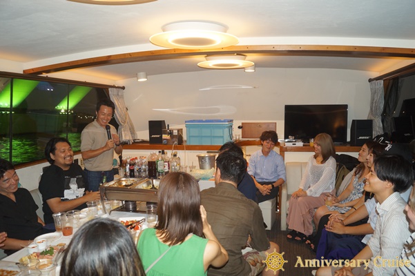 今回のクルージングでは、ドリンクのみのご提供でしたので、船内は交流しやすいように座席をレイアウトしました。(↓写真は2階フロア)