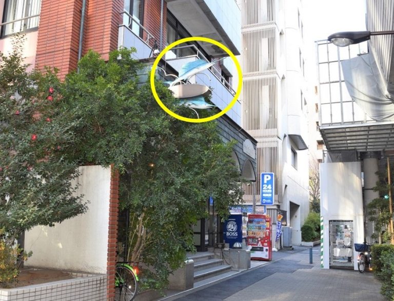 青い魚が付いている、茶色いビルです。