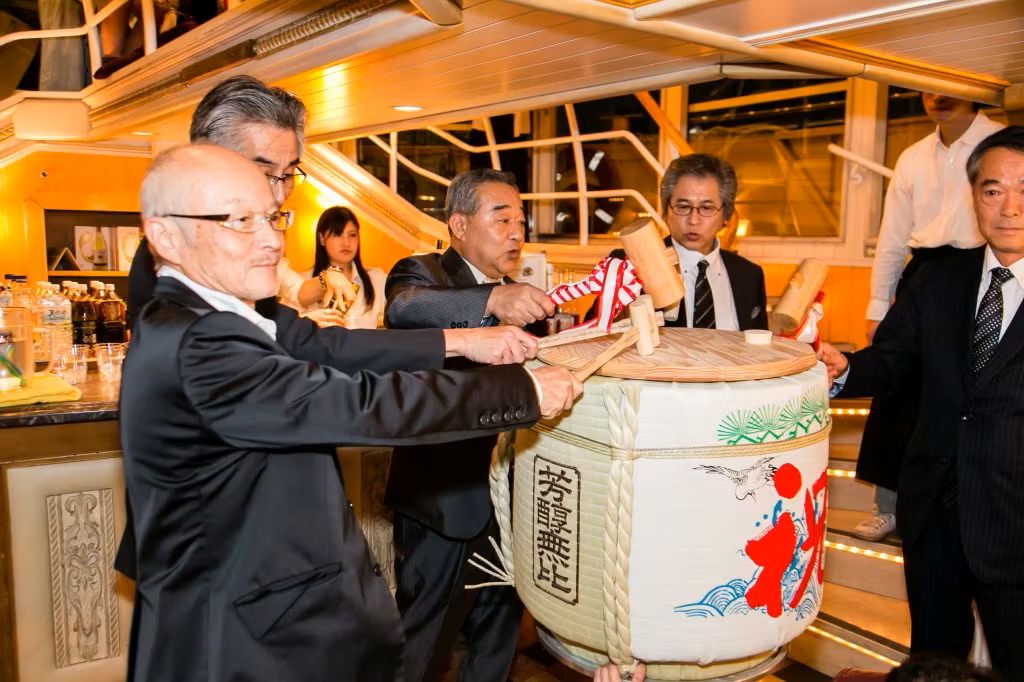 アニバーサリークルーズのオリジナル酒樽と木槌やひしゃく、升まで